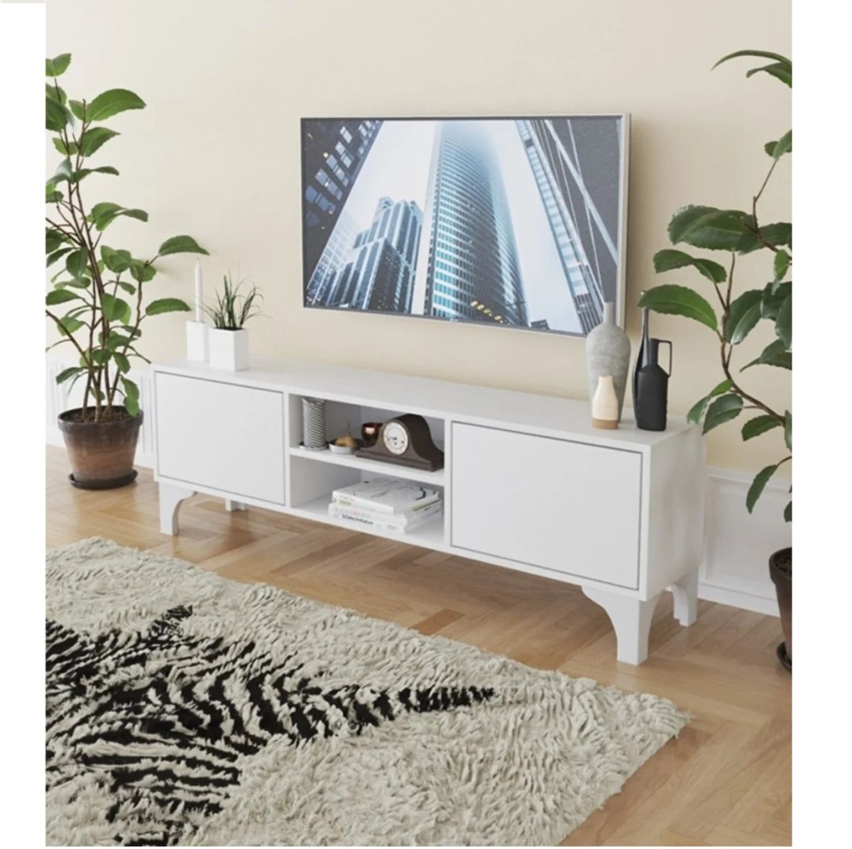 Elegante si mai ales multifunctionale, comodele TV sunt si suport pentru plasma, dar si loc pentru depozitarea electronicelor. Intr-o nuanta de alb lucios, aceasta comoda TV este piesa ideala din acest living avangardis. Are spatii suficiente pentru carti, agende, telecomanda sau consola de gaming.