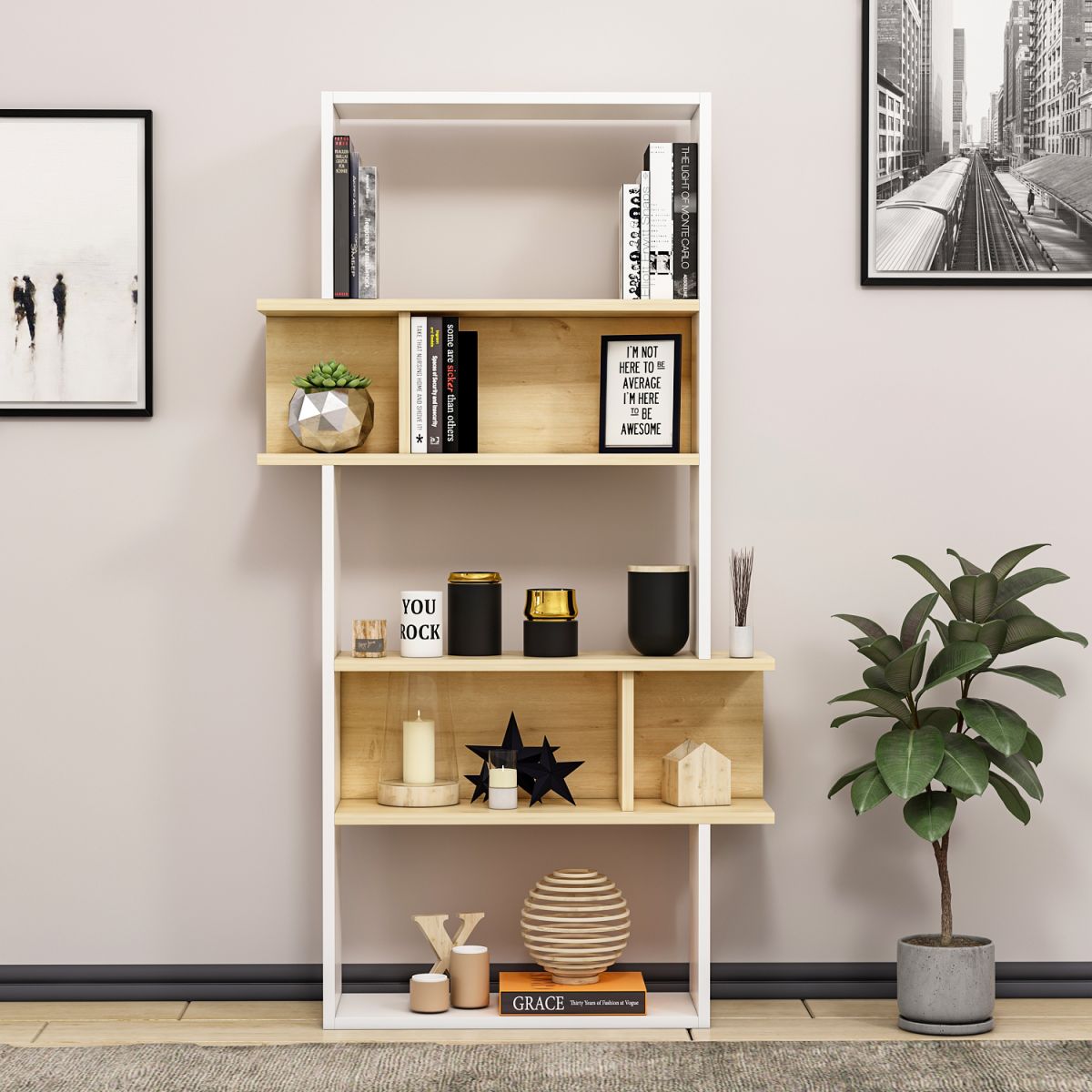 Mai apoi, ai nevoie de o biblioteca ampla, pe care sa-ti aranjezi cartile si piesele art deco. Sugestia noastra este aceasta biblioteca Daiana in combinatie de pal alb cu stejar. Biblioteca are 1 corp de depozitare de dimensiuni medii, cu 5 rafturi cu design modern in combinatie de culori alb cu stejar. Este realizata din pal de 18 mm si are un finisaj glossy, si vine sa ti faca livingul mai practic si mai elegant.