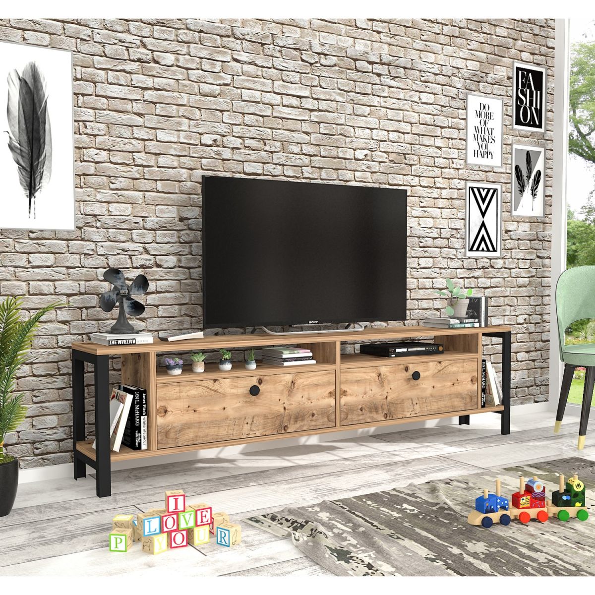 Comoda tv cu picioare metal Homs 150 cm este o piesa decorativa oultramoderna, pentru cei ce doresc sa fie mereu in trend. Atat combinatia actuala de culori-nuc- picioarele metalice, cat si formele deosebite recomanda aceasta comoda tv iubitorilor de nou si frumos.Nuanta texturata a blatului inspirata de cea a stejarului natur, aduce cu sine mai mult rafinament in camera de zi. Aceasta se asorteaza usor si cu alte culori, cum ar fi griul prezent pe comoda.