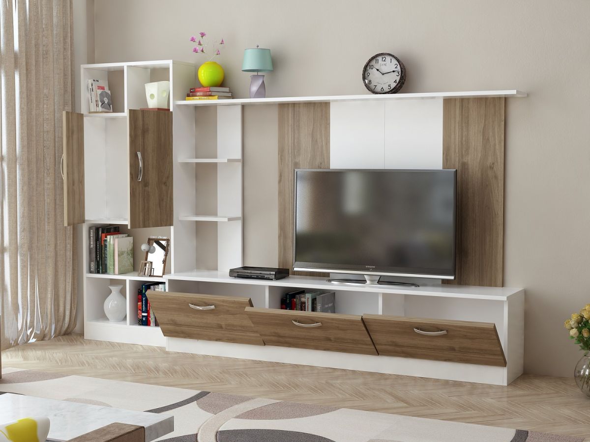 Acest set practic indicat pentru tot peretele contine o biblioteca living si comoda TV in nuante luminoase de alb si bej. Modelul este unul inovator, extravagant, care te uimeste cu functionalitatile sale. Poti sa aranjezi televizorulpe blatul de jos, principal, iar deasupra, poze,carti, amintiri din concedii, accesorii de birotica, consola de gaming si multe altele.