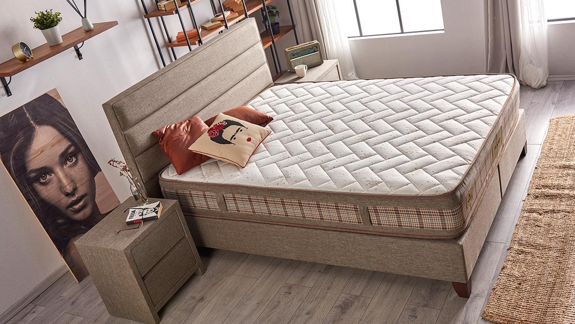 Culoarea neutra il face usor de combinat cu un sifonier alb sau crem si cu noptiere in lateralul patului.