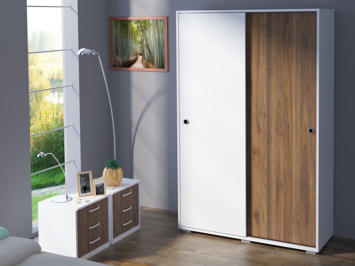 Joaca-te cu nuantele si adu o tenta lemnoasa. Acest dulap usi glisante alb cu nuc este perfect pentru un interior mediu sau restrans, pe care vrei sa-l personalizezi dupa bunul plac. Insertia de alb si nuc este una revigoranta, care creeaza un dinamism cromatic placut in orice dormitor.