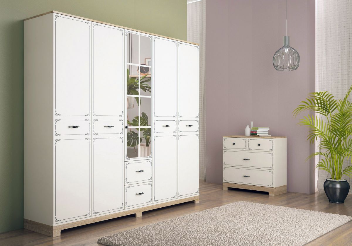 Aspectul modern este completat de finisajul placut la atingere si de oglinda generoasa de pe usile sifonierului. Modelul practic si de efect poate fi utilizat pentru aranjarea ainelor, lenjerie de pat si a gecilor sau camasilor aranjate pe umerase, dispuse pe o bara metalica. Dulapul incapator este prevazut cu 5 compartimente generoase, in care-ti poti aranja mai bine hainele impaturite.
