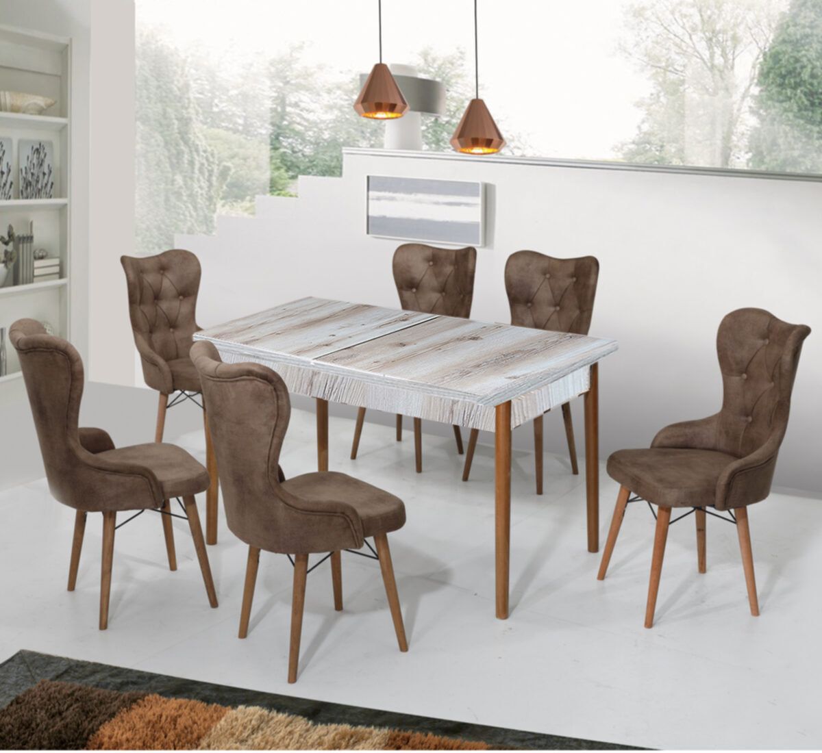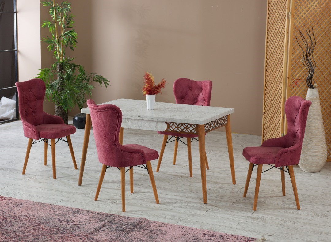 Scaunele prezente in acest set reusesc sa intre intr-un contrast foarte cald si placut ochilor cu nuanta mesei. Fiecare scaun in nuante de roz pudrat, este tapitat cu material textil rezistent si moale la atingere, ce creste considerabil gradul de confort resimtit.