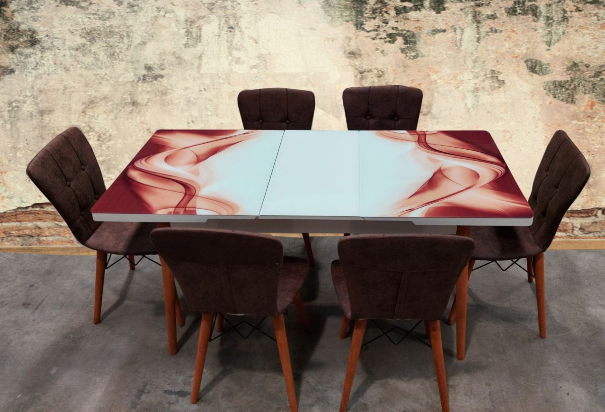 Sfatul designerului: Pentru a crea senzatia de mai mult spatiu foloseste culori deschise. Mesele extensibile cu blat alb si cu decoratiuni in blatul de sticla termorezistent sunt cele mai inspirate alegeri.