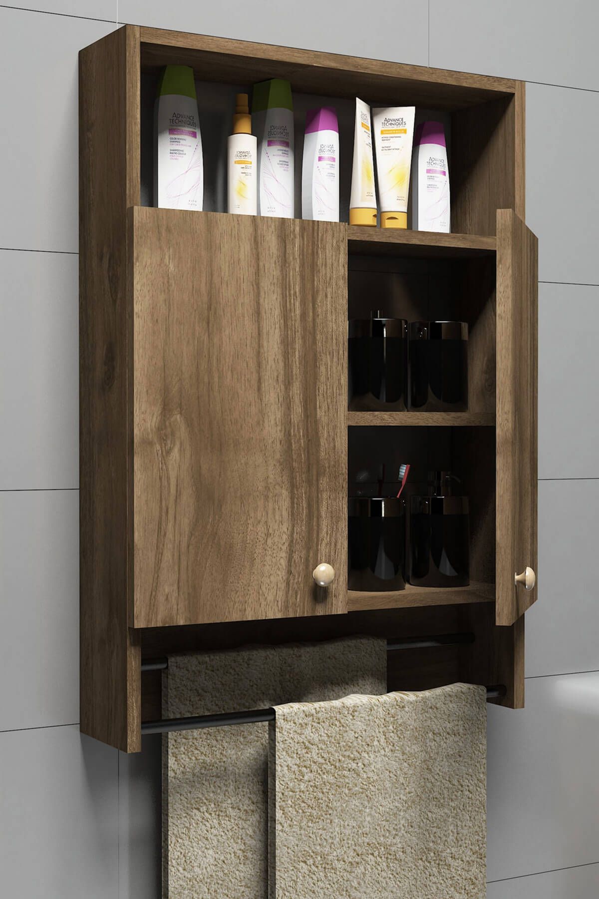 Acest model pe nuante de nuc serveste si ca spatiu de uscare pentru prosop, dar este prevazut si cu rafturi pe care poti pune cremele si alte accesorii de ifiena. Pe partea de jos poti pune prosoape la uscat si un halat cand te schimbi.