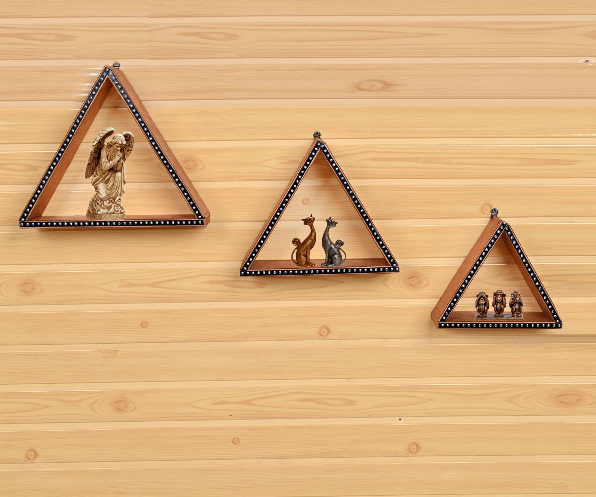 Cele 3 rafturi in forma de triuunghi le poti aranja impreuna pe un perete, sau separat, deasupra canapele sau patului. Sunt practice si cu siguranta rafinate, creand un set atemporal si atragator. Poti aranja pe ele carti, poze sau o sculptura art nouveau.