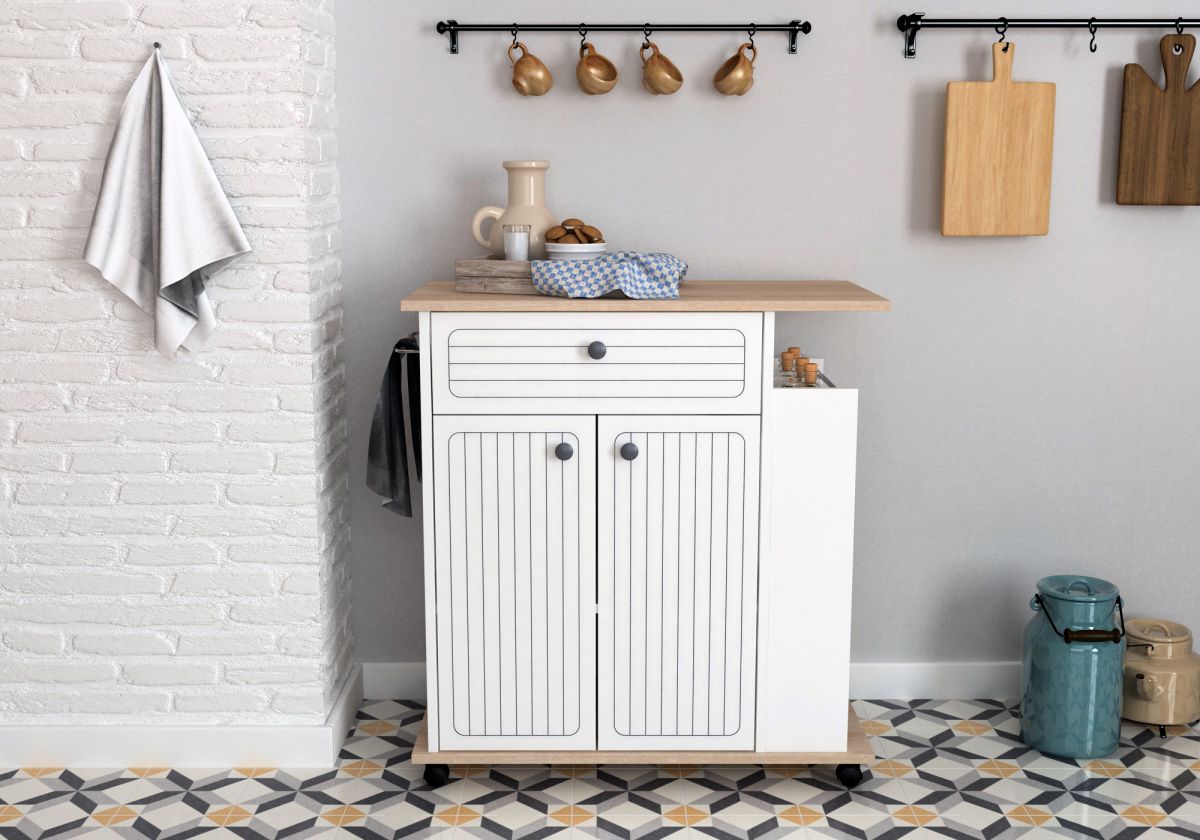Cu cat ai mai mult loc de miscare, cu atat vei avea un spatiu mai bine optimizat. Alege un dulap functional bucatarie cu rotile Mier Homs alb/stejar sonomo. Este dotat cu o bara pe care poti aseza servete de bucatarie sau ustensile, iar in partea opusa 3 rafturi deschisa pentru a avea tot timpul la indemana condimentele. Pentru a depozita intr-un mod ordonat mai ai la indemana un sertar si 2 spatii inchise cu usi.