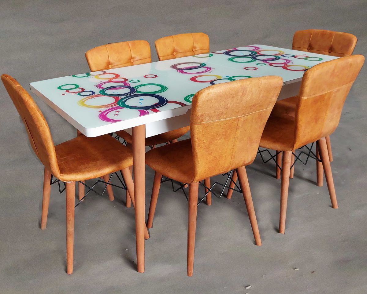 Pentru ca-n bucatarie se gateste mereu, ai nevoie de piese care sa se mentina in timp. Cea mai inspirata alegere este un set masa extensibila picioare lemn, blat sticla securizata +6 scaune tapitate Fusion Homs mustar-multicolor.