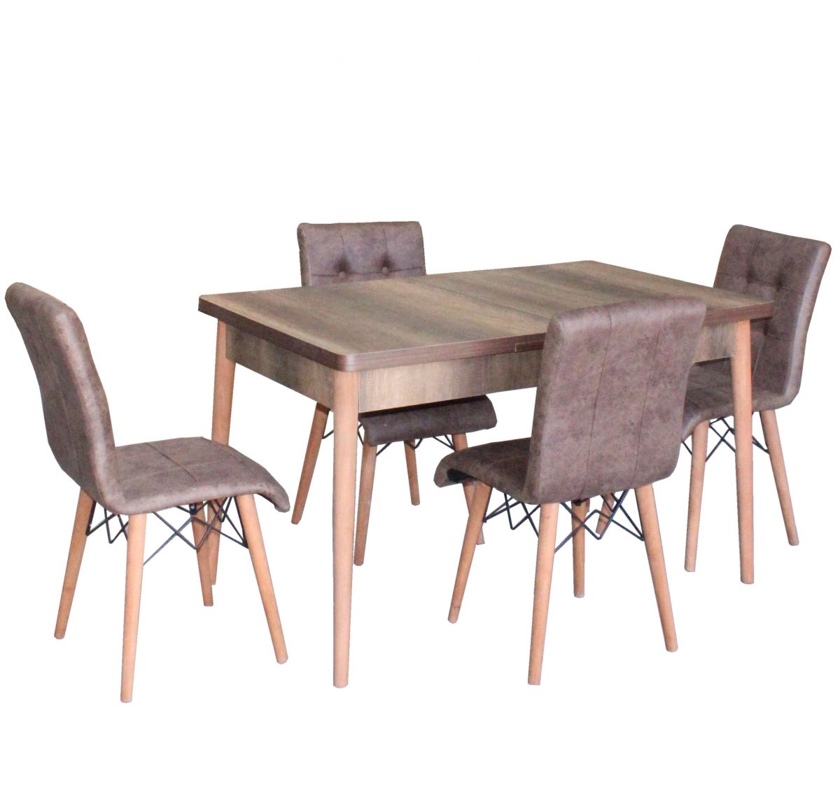 Setul cu aspect de nuc trece foarte bine ca piesa centrala atat intr-un cadru clasic, cat si intr-unul modern. Zona de dining este diferentiata astfel, cu mai multa eleganta, datorita acestui set unic, cu linii drepte si design multifunctional. Este un set modern, cu masa de culoare bej, cu textura de lemn si cu picioare din lemn culoare nuc, cu finisaj lucios. In plus, cele 4 scaune sunt tapitate cu material textil maro si au si acestea picioare de lemn, rezistent, care nu sunt afectate de umezeala.