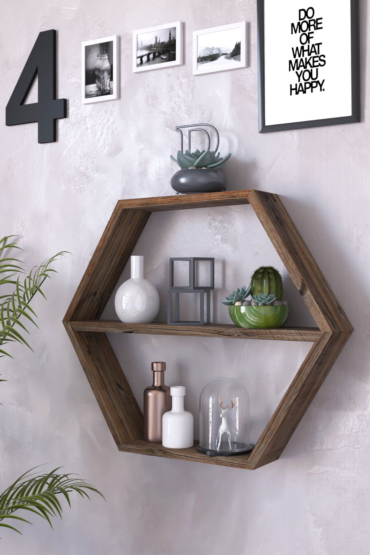 Indiferent daca ai obiecte decorative la expus sau vrei sa creezi un spatiu pentru a scoate in evidenta fotografiile incadrate, raftul de perete din lemn Hexagonal Homs va deveni punctul de atractie principal din camera. Dispunand de un format unic, acesta ofera un spatiu decorativ si functional pentru biroul de acasa, camera de zi, sau bucatarie. Modelul geometric este un must-have in trendurile decorative contemporane.
